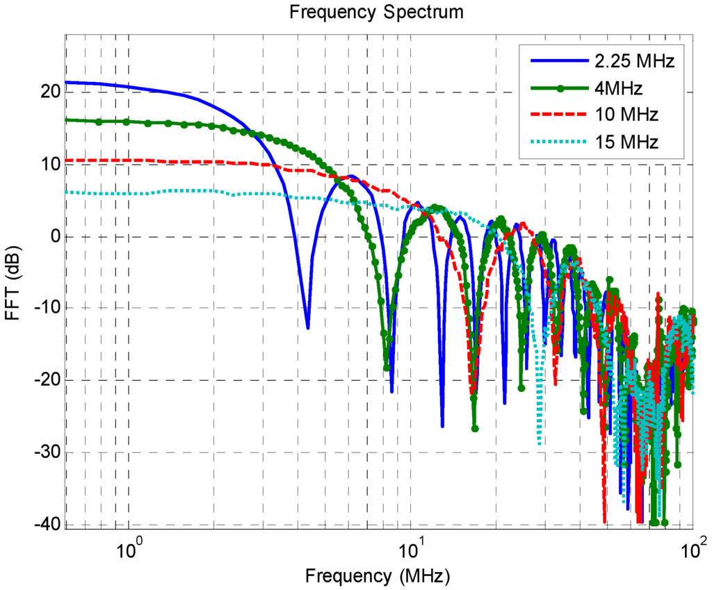 Frequency spectrum of square wave pulses tuned to half-frequency of transducers with 2.25, 4, 10 and 15 MHz center frequency.