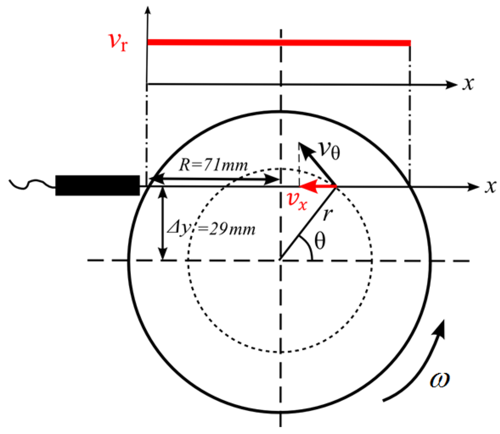 The velocity measured by the ultrasonic technique is in the transducer line direction, and it is represented by vx. Using trigonometric relations vx is related to ω by:
