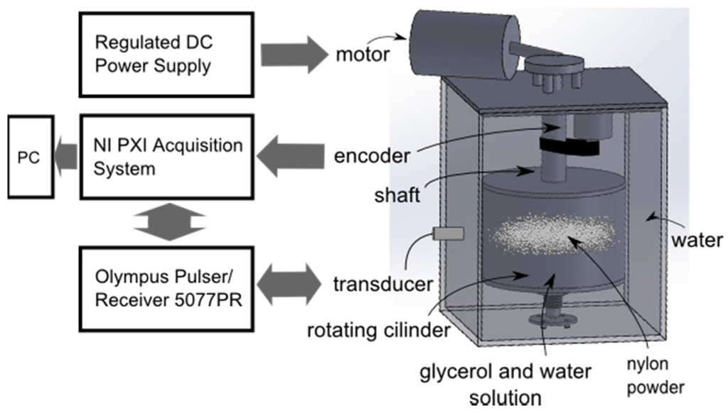 where ω is the angular velocity and Δy is the distance between the transducer measurement line and the cylinder center, which for this work was 29 mm. The complete experimental apparatus is described in Figure 9. A rotating cylinder was filled with a solution of water/glycerol and tracer particles of 80 µm to 200 µm (Model 1A P82, EMS GRILTECH, Via Innovativa, Switzerland). Both liquid and particle have the same density (1.07 g/cm3). An electric motor was used to rotate the apparatus and the rotation speed was monitored with an encoder type sensor.