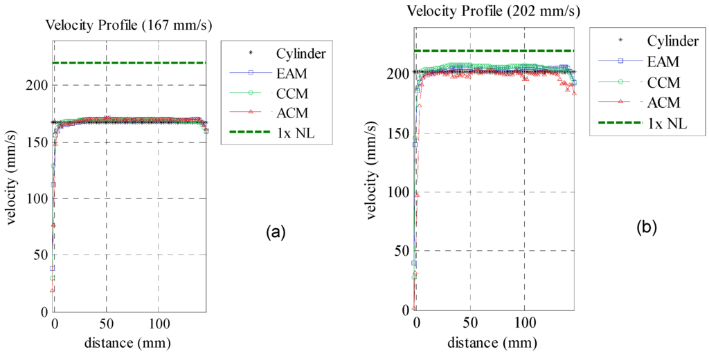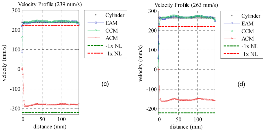 Velocity profile for a set of chosen cylinder velocities for ACM, CCM and EAM. (a) Cylinder velocity of 167 mm/s, under the Nyquist limit; (b) Cylinder velocity of 202 mm/s, under the Nyquist limit; (c) Cylinder velocity of 239 mm/s, over the Nyquist limit; (d) Cylinder velocity of 263 mm/s, over the Nyquist limit.