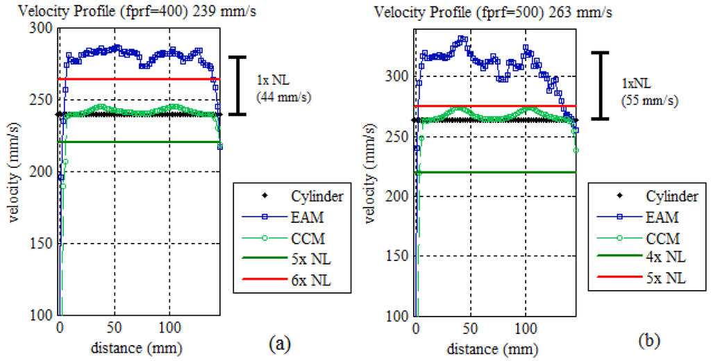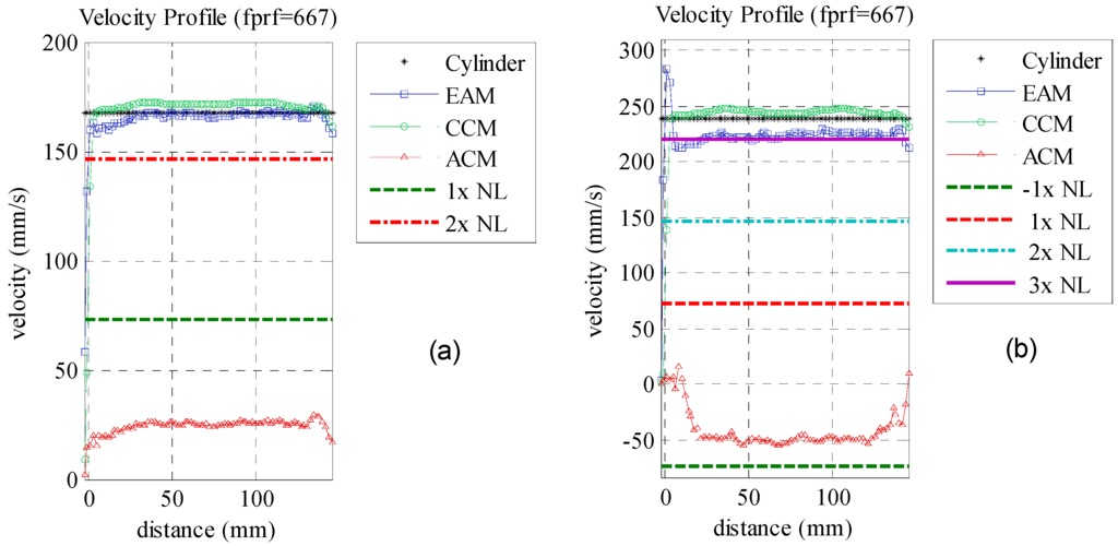 Previously the EAM was compared with ACM and CCM for velocities beyond one time the Nyquist limit. Higher velocities were not validated due to the limitation on the used motor. An alternative to evaluate the maximum measurable velocity was to reduce the pulse repetition frequency by decimating the original signal. Figure 11 shows the velocity profile of three times decimated data for velocities of 167 and 239 mm/s (fprf = 667 Hz). The first velocity shown in Figure 11a, is over two times the NL. In this condition, autocorrelation aliased velocities are positive, differently from the negative values seen in Figure 10c,d due to the one time NL difference. EAM and CCM measured velocities with CVRMSD of less than 1% compared to the cylinder reference velocity. The velocity of 239 mm/s presented in Figure 11b is three times NL.