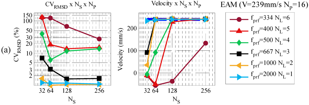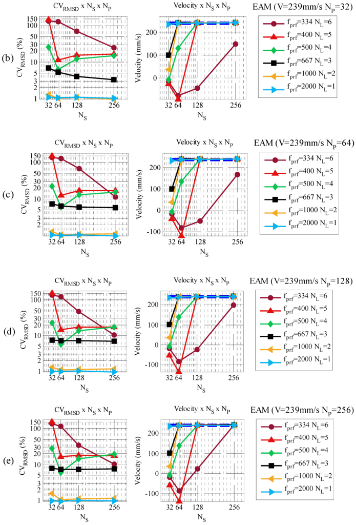 EAM presented two trend results. For NL ≤ 3 a lower NP and a higher NS are desirable. Measurements of less than 2% deviation are possible in this condition. Velocities in the range of 4 ≤ NL < 7 requires higher NP and a specific NS which is in the range between 32 and 256. Lower values of NS result on non-measurable velocities. Higher values of NS converge to a velocity aliased by one time the NL difference. This result indicates that phase aliasing are not completely corrected by EAM at higher velocities. A difference of 15–20% is observed in this situation, which at least is much better than no correction. The NS near 64 was the best condition in this experiment, but that may not be a general rule. In this context, 5 to 8% deviations are noted. Velocities of NL > 6 are not measurable regardless of the NS and NP employed. Based on this study a set of optimized spatial and temporal parameters is presented in Table 6.