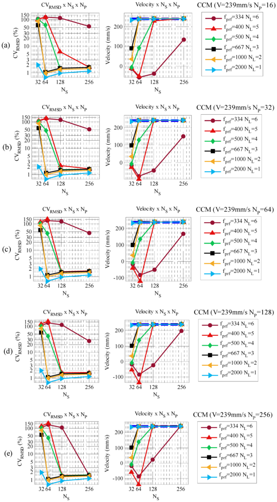 CCM results show that higher NS and NP are best for all measured velocities. However, to improve the spatial and temporal resolution those parameters needed to be reduced. In these tests, a trade-off between spatial and temporal resolution was observed. Velocities of NL ≤ 4 are measured using NP = 16 and NS = 32, 64, 128 and 256 as NL increases. Increasing NP allows the reduction of NS. For example, velocities of NL = 3 are measurable using NP = 16 and a minimum NS of 64. The same velocity is measurable by increasing NP to 32 and reducing NS to 32. Velocities in the range of 5 ≤ NL < 7 required NP ≥ 128 and NS ≥ 256.