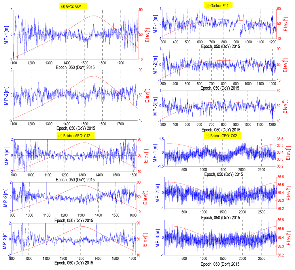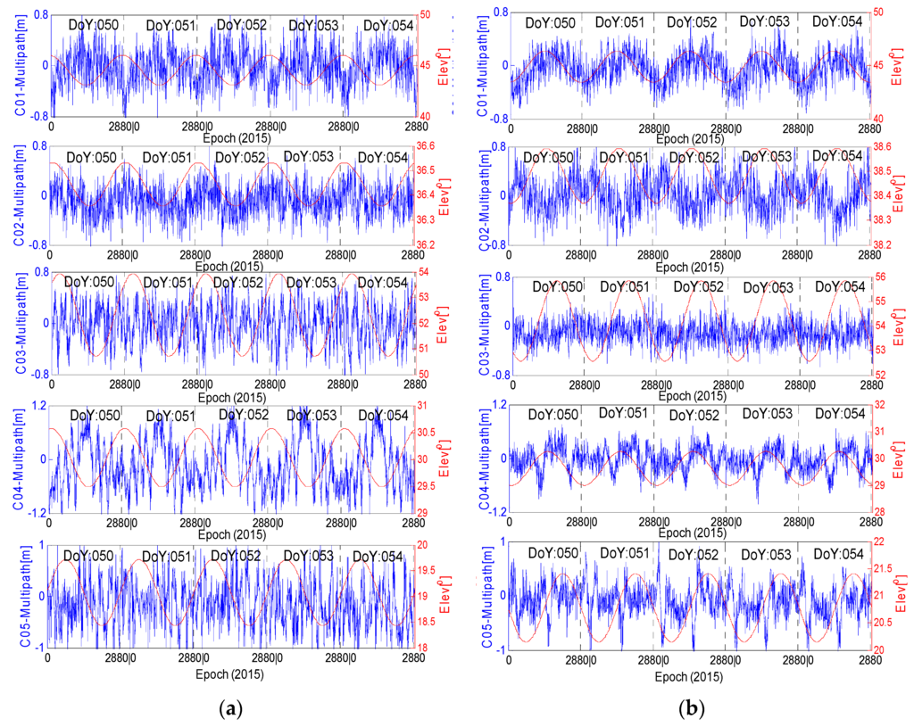 Figure 1 illustrates the multipath series of satellites G04, E11, C12 and C02 and summarizes the correlations between the multipath estimation and the elevation, as well as the time series. From Figure 1a–c, it can be observed that the amplitude and dispersion of the code multipath of the MEO satellites increase significantly as the elevation decreases. The multipath effect nearly increases to 2 m on the first frequency for the GPS system when the elevation is below 20° and the first frequency observable is more sensitive to the multipath effect than the second frequency. The code multipath of the Galileo satellite has the smallest amplitude and dispersion, for which the multipath variations are almost below 0.5 m and seem independent of elevation. Compared with (a) and (b), the multipath estimation of the Beidou MEO satellite (c) has a trough in all the time series when the satellite has the maximum elevation, and the amplitude becomes bigger when the elevation decreases, which suggests that there is an elevation-dependent bias in the multipath delay. In regard to the Beidou GEO satellite (d), the magnitude of multipath variation is many times bigger than that of the elevation variation, and the trend of multipath series behaves somewhat systematically correlated with time series, which are evidently different from the Beidou MEO satellites. These results agree well with some mentioned references.