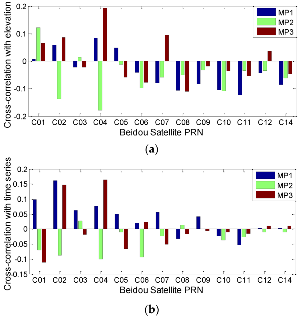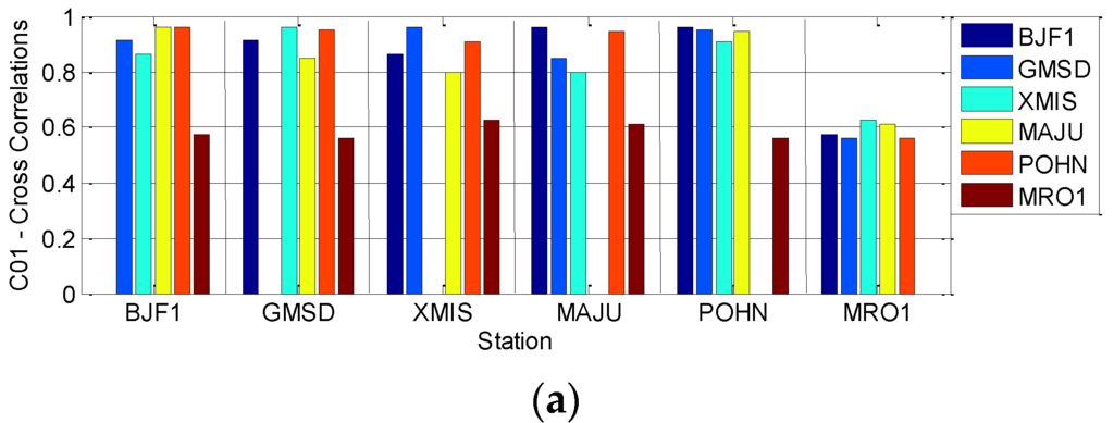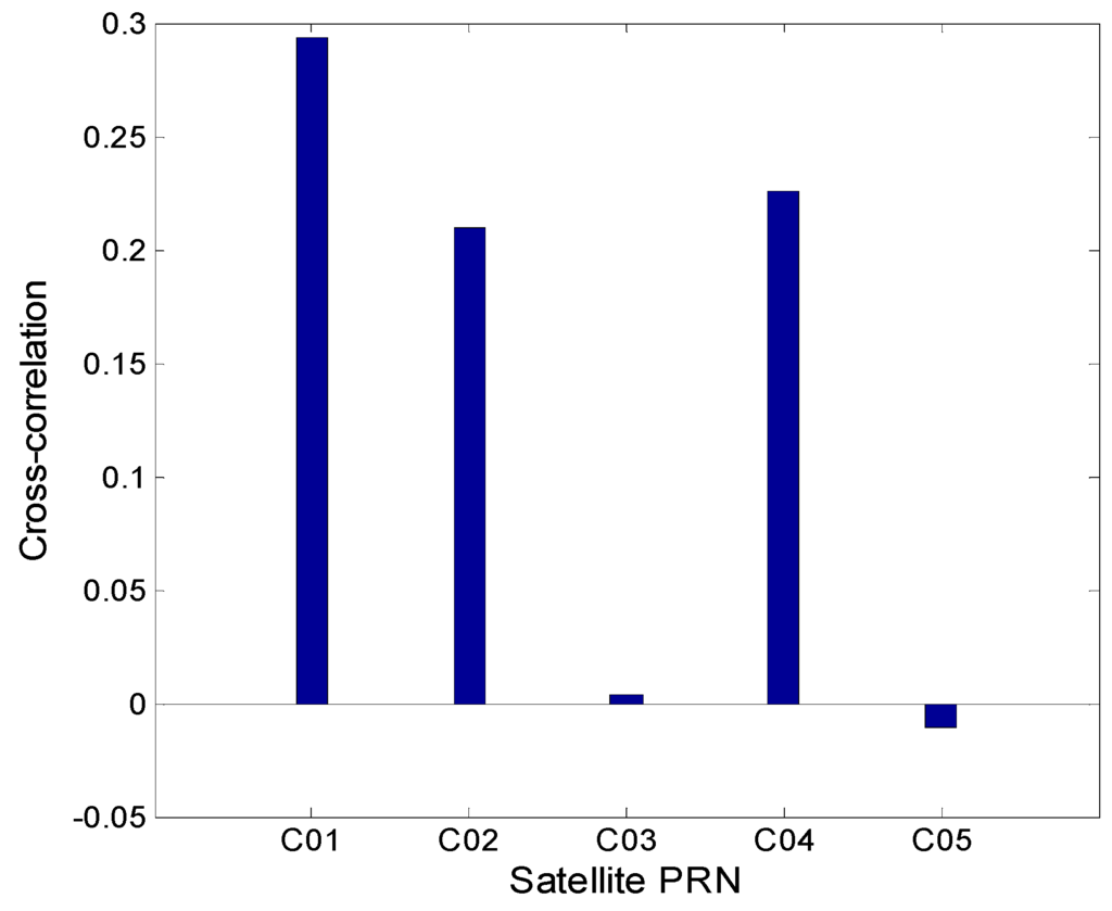 Figure 7 presents the Spearman cross-correlations between the multipath estimations at station CUT0 and those at station JFNG. The magnitudes of the correlations of C01, C02 and C04 are many times bigger than those of C03 and C05. This phenomenon verifies that there are some biases in satellitesC01 and C02, which affect the pseudorange observations at the two stations in terms of communal errors. C03 and C05 do not show such systematic bias. Because the data of satellite hardware is not available, the possible reason may be that satellites C03 and C05 do have not such bias or these biases are constants, which are absorbed in B in Equation (1). Reference [1] reported that satellite C03 had the best code data quality, with the smallest standard deviation compared with that of C01, C02 and C04 (C05 was not available in that paper); the reason may just be that C03 has no such systematic code bias. The overall magnitudes of all the cross-correlations are not as large as expected, being mainly affected by the code observation noise, whose standard deviations are even larger than the variations of the code bias under some conditions.