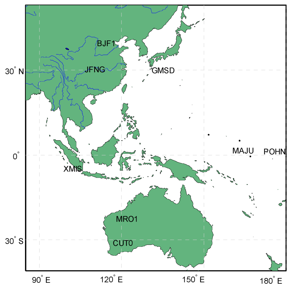 Figure 2 shows the Spearman cross-correlations between the multipath delay and the elevation, as well as time series. For Beidou non-MEO satellites, nearly all the correlations with elevation are negatively related, except those for C07 and C12 on the third frequency, and the correlations between multipath delay and time series are quite low and only partially positive, considering different satellites and frequencies. These results, to some extent, verify the existence of elevation-dependent code bias in the multipath delay. For Beidou GEO satellites, the correlation results show that the multipath delay has correlations with both time series and elevations. However, the GEO satellites show daily variations in their fixed frames of the order of approximately 2000 km, which results in their elevation also having the daily variation periodicity characteristic [11]. The variation of GEO code bias should be carefully analysed to be reasonably mitigated. For this purpose, it becomes necessary to analyse observations from some stations with different elevations. Although some conclusions have been made before [11,17], to guarantee the correctness and reliability of the following findings, we conduct this work again by using newer and more data collected from stations that are distributed over the entire Asia-Pacific region. Based on this, we select 8 stations distributed over the Asia-pacific region as experiment subjects; their distributions are depicted in Figure 3. The observation sampling interval is 30 s. Most of the stations come from the MGEX network, except station BJF1, which comes from the Chinese iGMAS network. To explicitly describe the periodical variation trends of the GEO-based code bias over consecutive days, we select the multipath series from 50 to 55 days of year (Doy), 2015, as representative results to illustrate the multipath effects.