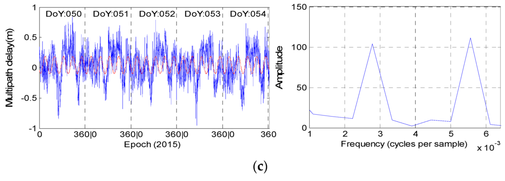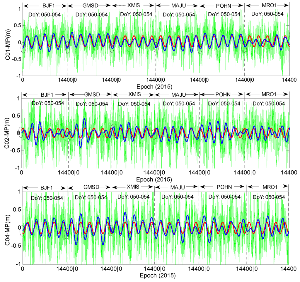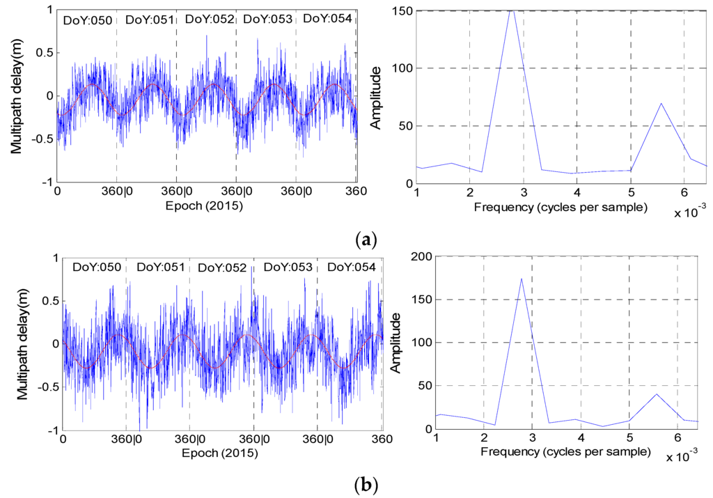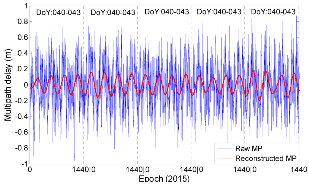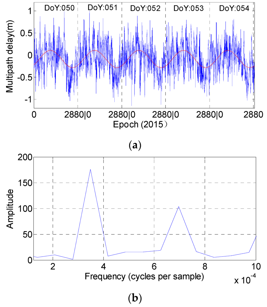 - After many fitting methods were tested, we found that the trigonometric function is the most effective for this study because this method yields the smallest RMS value among the tested fitting approaches. The estimation of code bias Cb can be modelled as:where x represents the time difference between observation time and midnight on 050 (Doy), 2015, with the unit of seconds, and ω, a, b are the unknown parameters. To facilitate the least squares adjustment, we transform Equation (4) into the standard indirect adjustment model; it is expressed as:where are the corresponding prior-estimations of the three unknowns and is the value of the reconstructed signal at time x. After the least squares adjustment of the model unknowns, all the unknown estimates are summarized in Table 1. The results indicate that the magnitudes of bias corrections of the first and second frequencies are at the same level, both being bigger than that of the third frequency. The periodicity signal, which is extracted from the multipath series of the third frequency, has the lowest amplitude. We use the equation:to estimate periodicity T. The results show that periodicity varies from 86,069 to 86,237 s for different frequencies and satellites, being roughly equal to the length of one sidereal day, i.e., 86,160 s. Note that the estimations of ω, a, b will change with the time varies; details of the relevant deductions will be discussed in another paper.