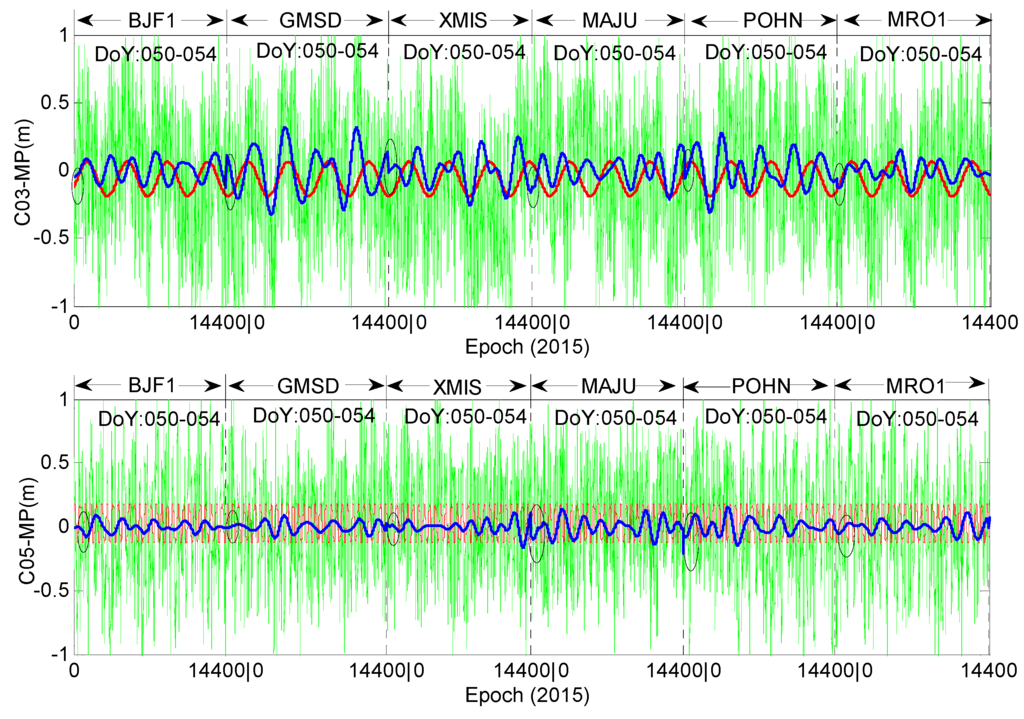 The multipath series of C03 and C05 at the other six stations. Green is the multipath estimation; red is the Fourier fitting results of the multipath series; blue is the wavelet reconstructed multipath series; the cycle is the edge of reconstructed multipath series between different stations.
