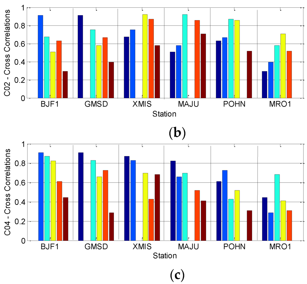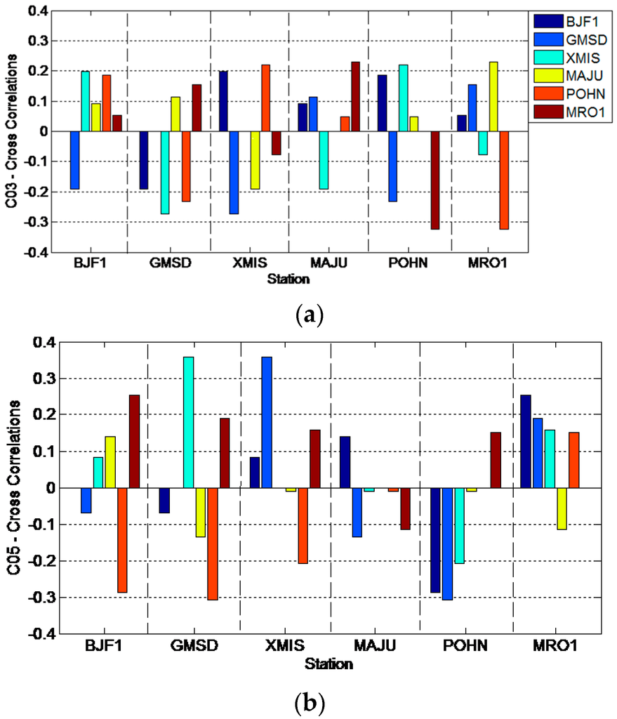 To quantitatively verify that the biases at the 6 stations are similar for certain satellites, Figure 8 and Figure 9 demonstrate the Spearman cross-correlations between multipath bias at the six stations for all five GEO satellites. Figure 8 presents the multipath correlations for satellites C01, C02 and C04. Here, all the Spearman correlations between multipath series at different stations are positively related. Most of their correlation values are larger than 0.5, except the results of station MRO1, which range from 0.3 to 0.5. These results demonstrate that their multipath biases are highly correlated, which means that the multipath variation trends at the 6 stations will be quite similar; otherwise their correlations will not be positive with such large values. On the contrary, Figure 9 shows that the multipath correlations of C03 or C05 are only partially positive; most correlation values are less than 0.3, which means that the bias variations at the six stations are not similar for satellites C03 and C05. These deductions from Figure 8 and Figure 9 further verify that bias with the daily periodicity characteristic is induced for satellites C01, C02 and C04, while the bias of satellites C03 and C05 has no such characteristic.