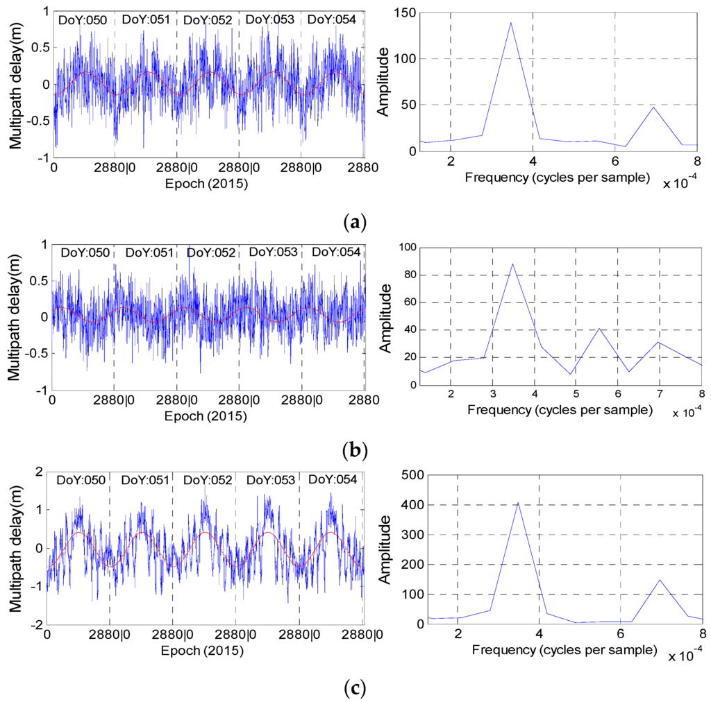 The code observations of the first frequency have the best signal quality, being able to clearly and directly present the required results [1,19]. On the contrary, many unrelated high-frequency signals are included in the third frequency observations; the following result (i.e., Table 1) also suggests that the amplitude of periodical variations of the third frequency is the smallest. The performance of the code observations of the second frequency is in between those of the other two frequencies. To show the periodicity characteristic of the code bias, as well as present how to detect and remove unrelated signals, we set the observations of the second frequency as an example to conduct the relevant analysis in Section 3. For simplicity sake, the multipath results of the other frequencies are not displayed here.