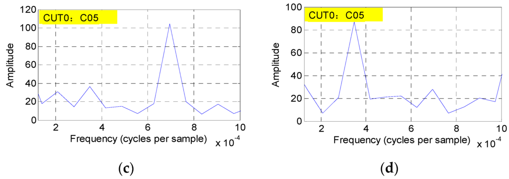 The magnitude spectrum of satellites C03 (a, b) and C05 (c, d) at stations CUT0 (a, c) and JFNG (b, d).