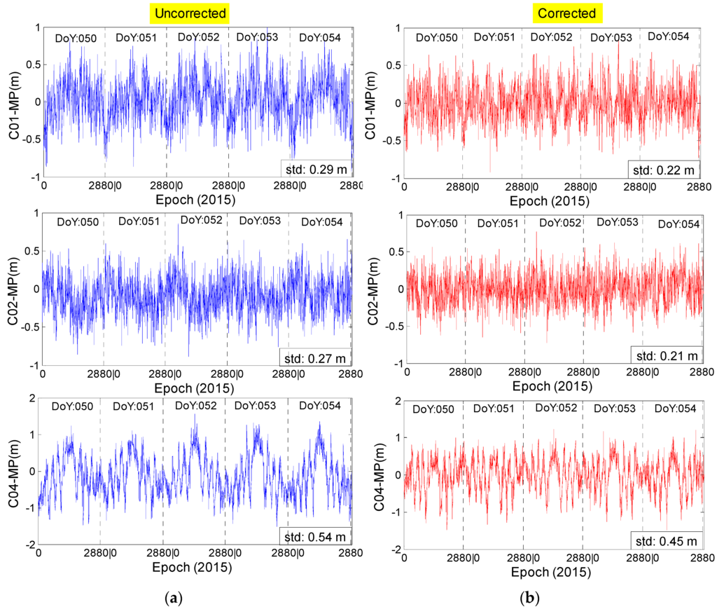 For comparison with the multipath series of satellites C01, C02 and C04 in Figure 4, the right panel in Figure 15 depicts the multipath estimations to which the time-dependent correction model has been applied. After applying the model, the time-dependent periodicity characteristic in the previous multipath estimations almost disappears. The standard deviation (std) decreases from 0.29 m to 0.22 m for satellite C01 and decreases by 0.06 m and 0.09 m for C02 and C04, respectively. It can be deduced that the signal quality is improved after the model has been applied.