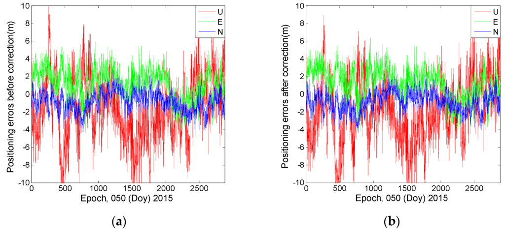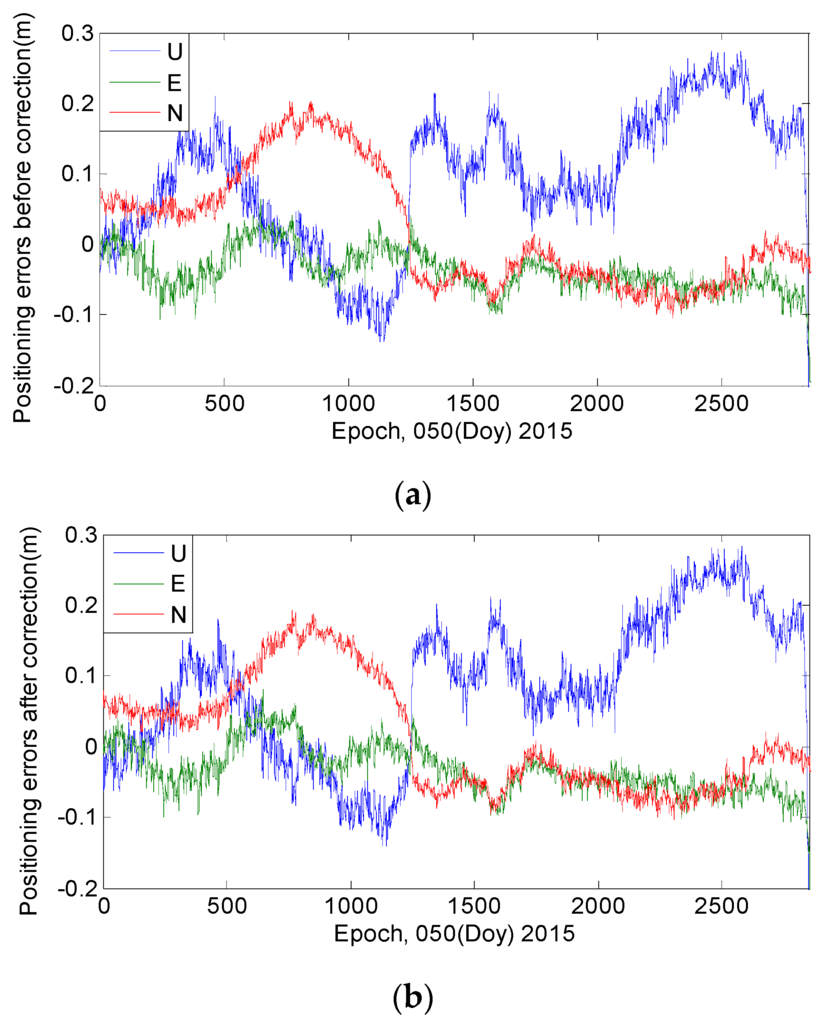 The SPP results estimated by using ionosphere-free combination of the first and second frequencies at station CUTO. (a) Represents the positioning errors before applying the correction model; (b) Represents the positioning errors after applying the correction model.