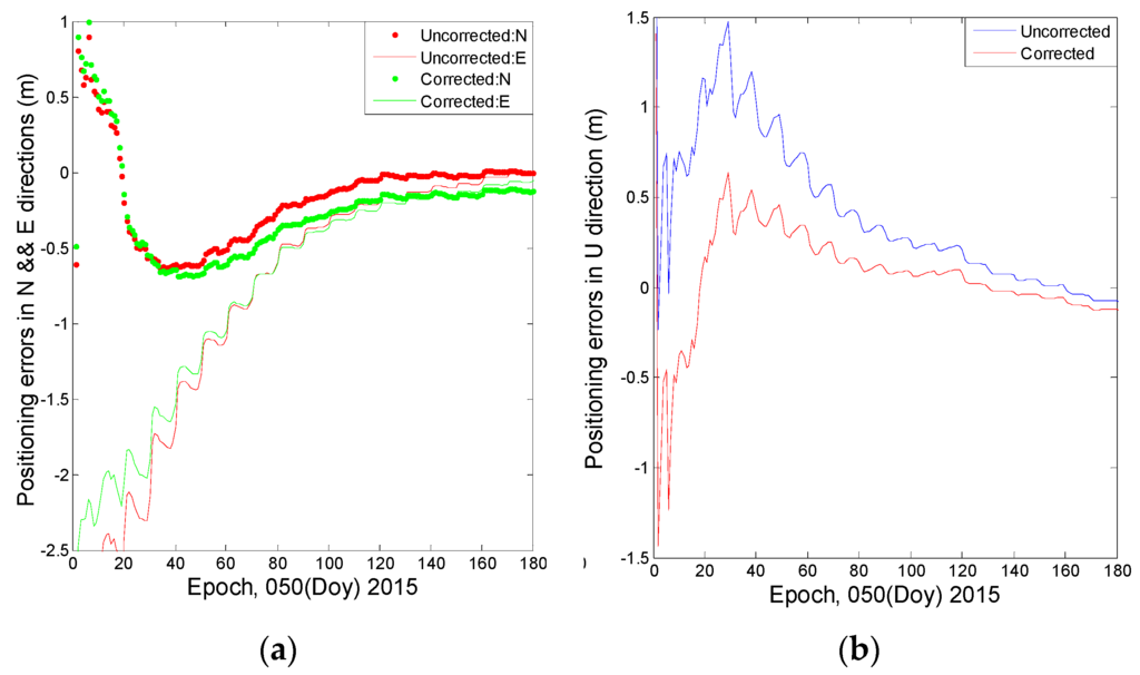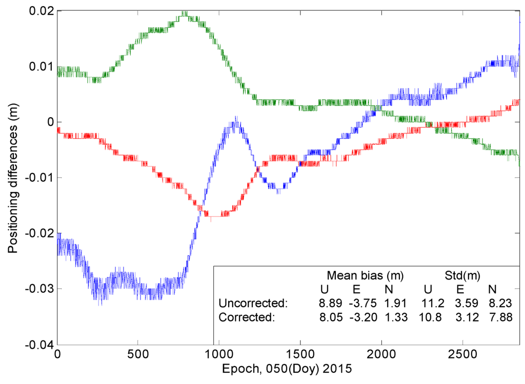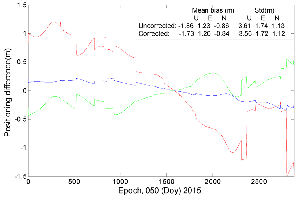 “Positioning difference” is the difference between SPP estimations with and without employing the correction model. The “mean bias” represents the equal result of the positioning errors. “Uncorrected” indicates the results when the code bias is not corrected; “Corrected” indicates the results after the model has been applied.