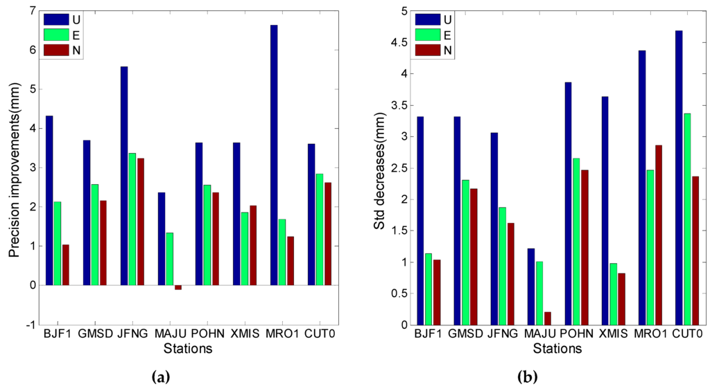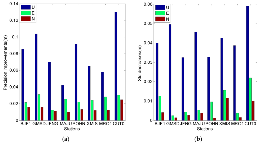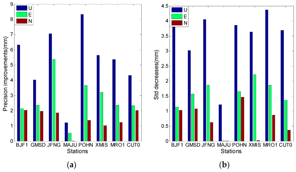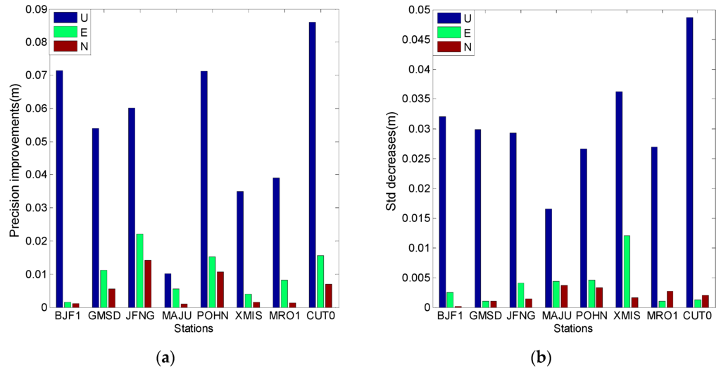 The kinematic PPP results using ionosphere-free combination of the first and third frequencies. (a) Describes the precision improvements after the model is applied; (b) Describes the std decreases after the model is applied.