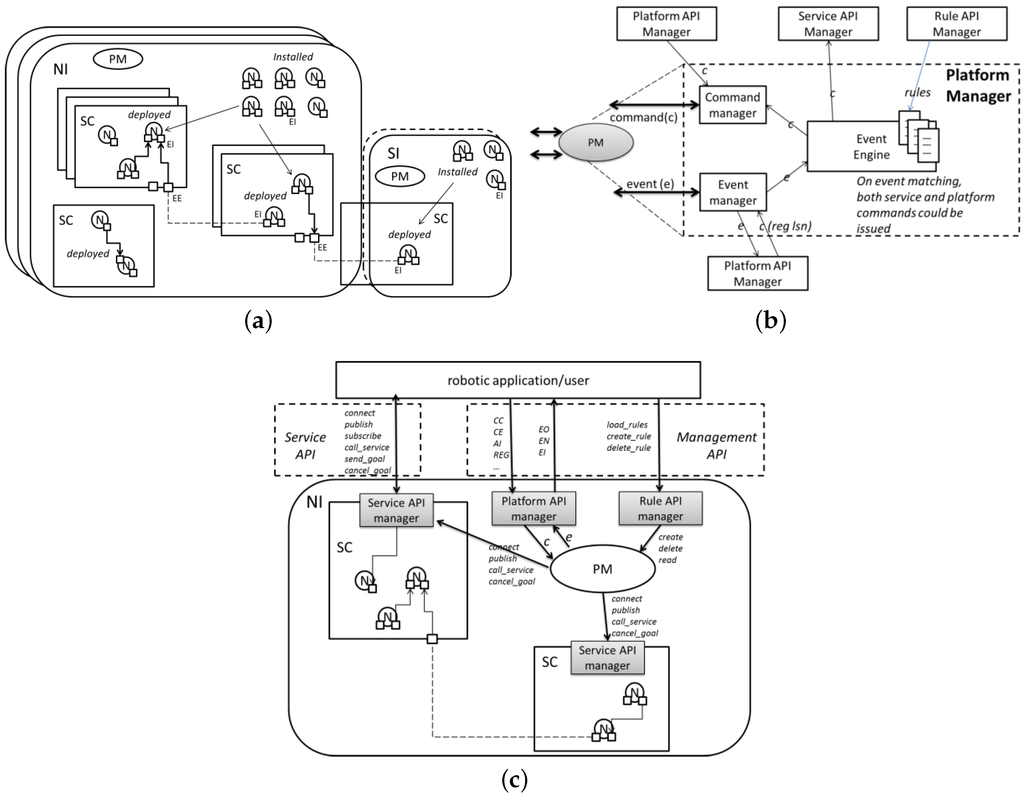 The service API manager is a special node that needs to be started in the service container. It exposes APIs to the external world for managing service commands and events. External API managers, such as robotic applications and the event manager, access different kinds of APIs (Figure 2c): the platform API manager exposes APIs to manage the platform commands and events; the rule API manager exposes APIs to manage the procedures for the event engine.
