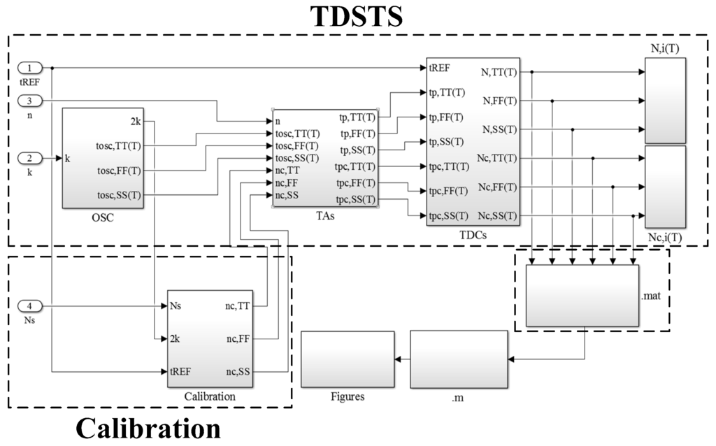 Figure 5 presents the detailed construction of TDSTSs in the SIMULINK environment for (a) the block of the oscillator including the library; (b) the block of the TAs; and (c) the block of the TDCs. The sensor codes (Ni(T) and NC,i(T)) for the two sensors are generated by the two TAs and the corresponding TDCs. Their operation is totally identical except for n and nC,i. Although two sensors were designed in this simulator, the total simulation time was not increased considerably because the proposed simulator is concise and performed by using SIMULINK, which was a notable advantage of the SIMULINK platform.
