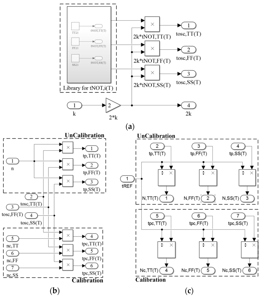 As shown in Figure 5a, by the product of 2 and k and the captured models in the library, the tOSC,i(T) are generated and used in the two sensors. Simultaneously, the value of 2 × k is sent to the calibration block (next subsection). Next, when the tOSC,i(T) is amplified with n or nC,i generated from the calibration block, the tP,i(T) in the uncalibrated sensor and the tPC,i(T) in the calibrated sensor are produced, as presented in Figure 5b. Figure 5c presents the process generating Ni(T) or NC,i(T) by counting tP,i(T) or tPC,i(T), respectively, by using the tREF. The three steps refer to Equations (2) and (5).