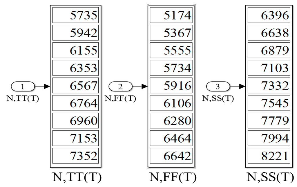 First, considering the uncalibrated sensor (i.e., the simple sensor without calibration), the input values of the parameters are k for determining the oscillation period width tOSC,i(T) (i denotes the three process corners: typical-typical (TT), fast-fast (FF), and slow-slow (SS)), n for amplifying the width to generate tP,i(T), and tREF for time-to-digital conversion. The results of Ni(T) are obtained using Equation (2) and the models of tNOT,i(T). Second, the process-variation calibration is activated by giving the value of NS on TC. Through Equation (3), the corresponding nC,i of the three process corners can be generated for the AGTA in the calibrated sensor. Then, the estimation of the calibrated sensor is performed. With the same tNOT,i(T), k, and tREF, the computation of Equation (5) generates the results of NC,i(T).