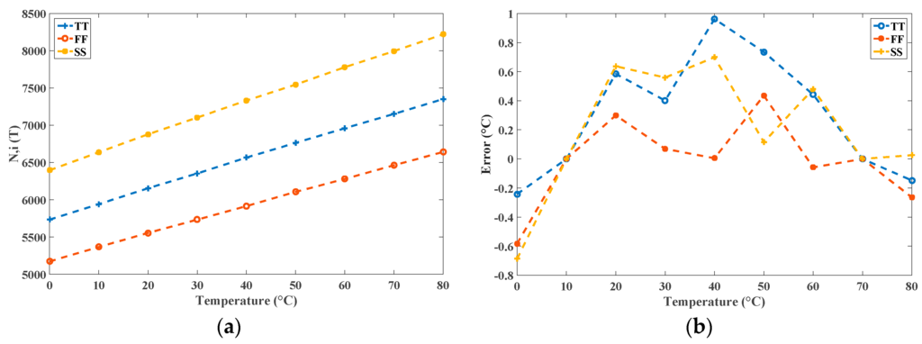 In the uncalibrated sensor, the value k = 21 was set to achieve a relatively wide oscillation period width tOSC(T) (for example, 2 × 21 × tNOT,TT (40 °C) = 32.832 ns) for low power consumption. In additional, the fixed time gain n = 5000 was set for a satisfactory R. With the transistor-level simulations using HSPICE, the simulation time for the three process corners in 10 °C steps from 0 °C to 80 °C was around 27 hours to derive the results. By the contrast, under the same simulation setting, the total simulation time of the proposed system was only a few seconds, which saved a notable amount of time. After the proposed simulation generated the outcome of Ni(T), it was stored in Ni(T) .mat; the graphical output is presented in Figure 7. MATLAB loaded the .m file, which contained the data of Ni(T), and produced figures depicting the linearity and the inaccuracies after two-point calibration, as shown in Figure 8. Furthermore, the figure generation procedure was simplified considerably. Simultaneously, the proposed simulator calculated the R values for the three process corners. For example, in TT mode, N(0 °C) = 5735 and N(80 °C) = 7352 were chosen with a temperature interval of 80 °C; the R was calculated as approximately 0.05 °C. Moreover, the estimated conversion time at 80 °C can be calculated as 183.8 µs (7352 × 25 ns) and the lowest CR is determined as 5.44 k samples/s in this TT mode. These operations demonstrated the functionality of the proposed simulator.