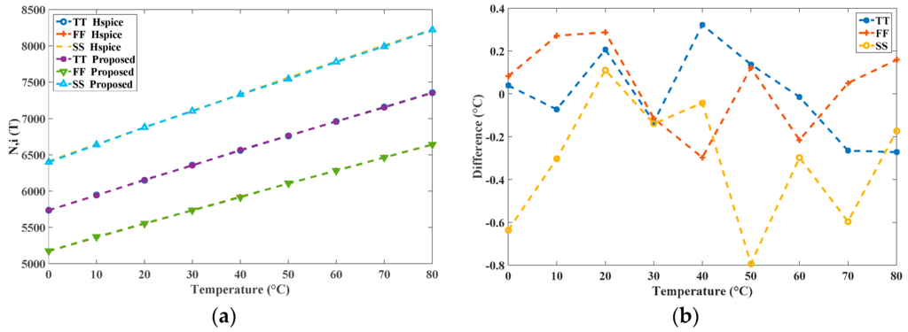 (a) Two simulation results Ni(T) from the proposed simulator and HSPICE; and (b) differences in degrees Celsius.