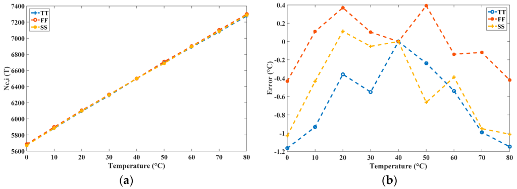 (a) NC,i(T) after process-variation calibration by using the proposed simulator; and (b) corresponding inaccuracies after one-point calibration for the calibrated sensor.
