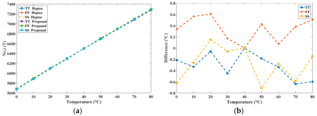 To further demonstrate the precision of the proposed simulator, the two simulation results Ni(T), and their differences in degrees Celsius, are presented in Figure 9 for comparison. The highly similar conditions between the behavioral and transistor-level simulators are shown. The maximal difference is within −0.8 °C~0.35 °C only, which verifies the functionality of the proposed simulator.