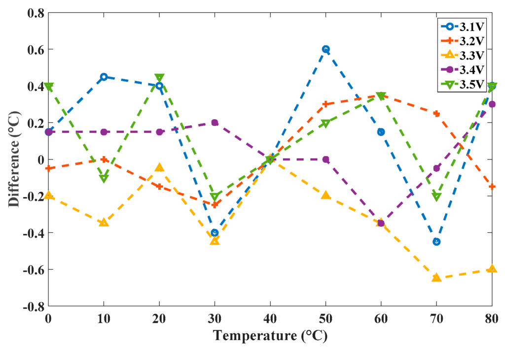 To verify the precision, a calibration was executed using HSPICE for comparison; this required a substantial amount of simulation time. The HSPICE-simulated nC,i were used as the corresponding time gain values to simulate a transistor-level calibrated sensor, and (predictably) the simulation time was very long. The simulation results NC,i(T) of the two simulators are shown in Figure 11a and the maximal difference is in the range of −0.7 °C to 0.6 °C, as shown in Figure 11b. The highly similar results of these tests validate the calibration of the proposed simulator. To further verify the effect of the voltage variation, we capture the models of the CMOS inverter from 3.1 V to 3.5 V and store them in the library. With the same operation, Figure 12 shows the corresponding differences and presents the similar results, which validate the proposed simulator for the different-voltage operation.
