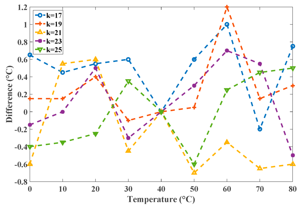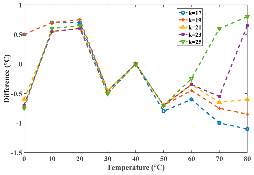 For precision considerations, the selected value of k also determines the precision of the simulator because of the precision of the captured models. Using the models listed in Table 1, simulations of the calibrated sensor were performed using the proposed system and HSPICE with values of k that varied from 17 to 25 with increments of 2. The corresponding differences in degrees Celsius are presented in Figure 13. The smallest difference was at k = 21; both k = 17 and 25 had larger differences than k = 21 did. The greater the distance between k and 21 was, the greater the difference was. This shows that the captured models for identical stages should be used to achieve the highest possible precision.
