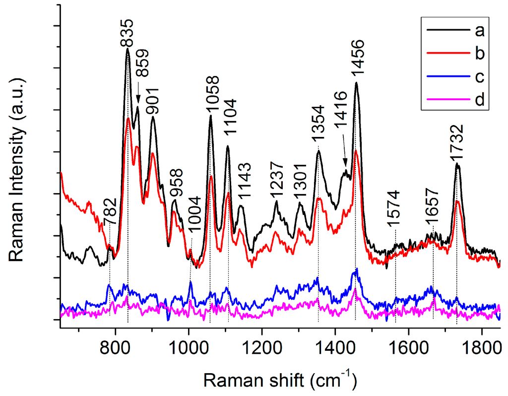 - Movasaghi, Z.; Rehman, S.; Rehman, I.U. Raman spectroscopy of biological tissues. Appl. Spectrosc. Rev. 2007, 42, 493–541. [Google Scholar] [CrossRef]