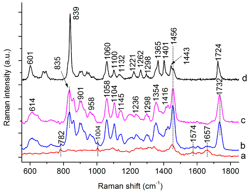 To verify the accumulation of PHB in the C. necator cells during batch culture, the Raman spectra of commercially available PHB, as well as those of bacterial cells cultivated for 0 and 48 h, were recorded (Figure 2, curve a,b). A comparison of the differential spectrum (Figure 2, curve c) obtained from the Raman spectra of C. necator cells at 48 and 0 h with the reference spectrum of pure PHB (Figure 2, curve d) shows that Raman scattering originating from PHB dominates the differential spectra, confirming PHB production during the cultivation period of 0–48 h. Major characteristic bands specific to PHB in C. necator cells are located at 835, 901, 1058, 1104, 1354, 1456, and 1732 cm−1. Some Raman peaks are shifted compared with those of the reference spectrum, which may result from differences in the physical state of PHB, with the amorphous state present in bacterial cells and the crystalline state in pure PHB []. As shown in Figure 1, the characteristic band at 1732 cm−1 is very strong, and there are no other peaks nearby. Therefore, this peak was chosen to quantify the PHB content in the C. necator cells. Apart from the bands originating from PHB, bands associated with nucleic acids (located at 782 and 1574 cm−1) and proteins (located at 1004 and 1657 cm−1) are observable in the Raman spectra of the C. necator cells (Figure 2, curve b). These bands could provide abundant information regarding the composition and structure of intracellular molecules in individual bacterial cells. Tentative assignments for the Raman peaks of the PHB and H16 cells are summarized in Table 1.