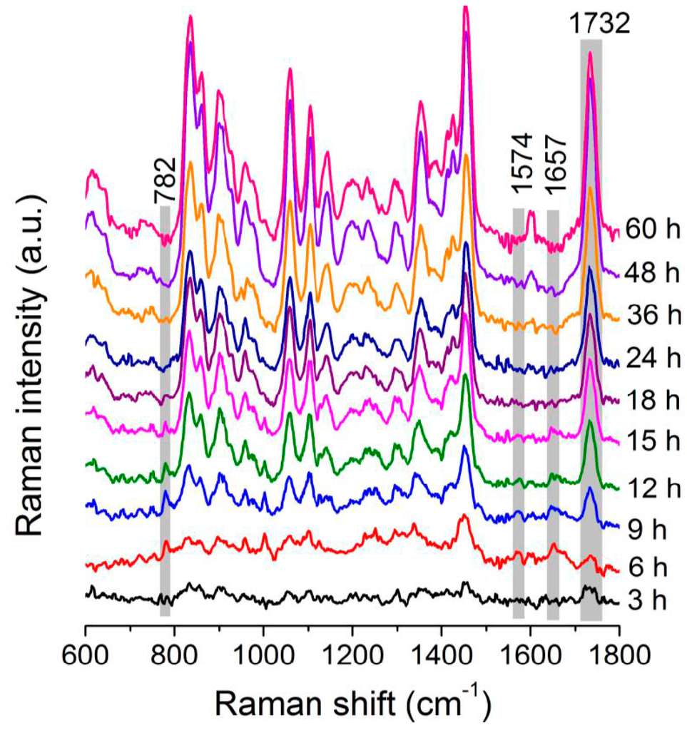 3.4. PCA of Raman Spectra of Individual C. necator Cells at Different Growth Stages