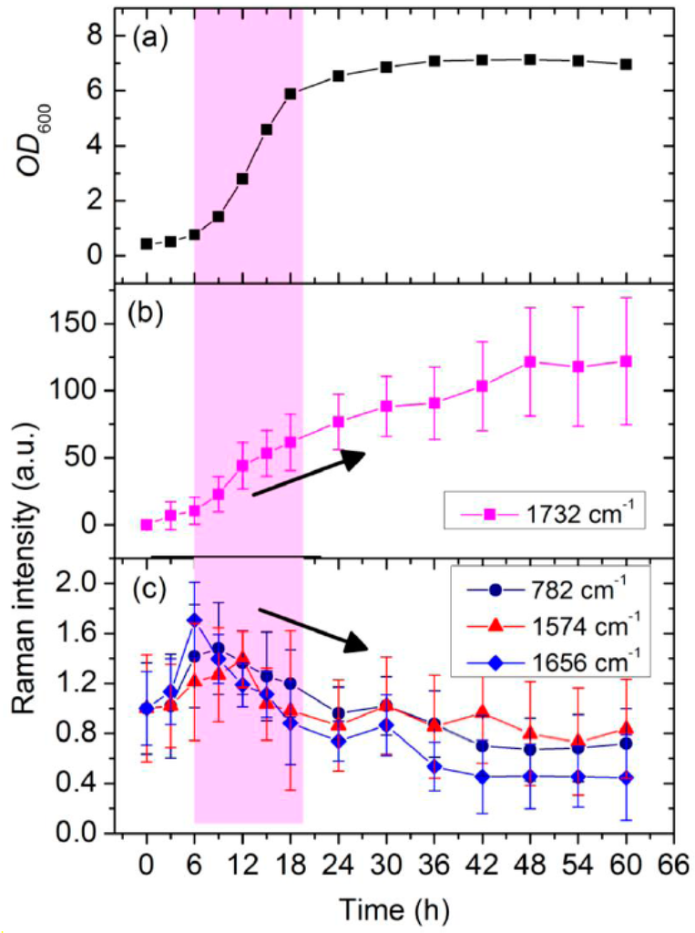 (a) Growth curve of a single culture of C. necator H16; (b) kinetic intensities of peaks at 1732 cm−1 (PHB); and (c) kinetic intensities of peaks at 782 cm−1 (RNA), 1574 cm−1 (DNA), and 1656 cm−1 (proteins), as functions of incubation time. The pink bar illustrates exponential phase of cell growth, and the error bar is standard deviation.