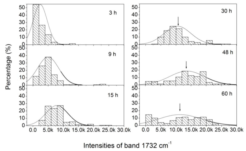 Histograms of intensities of Raman band at 1732 cm−1, obtained from 150 C. necator H16 cells after 3, 9, 15, 30, 48, and 60 h of incubation.