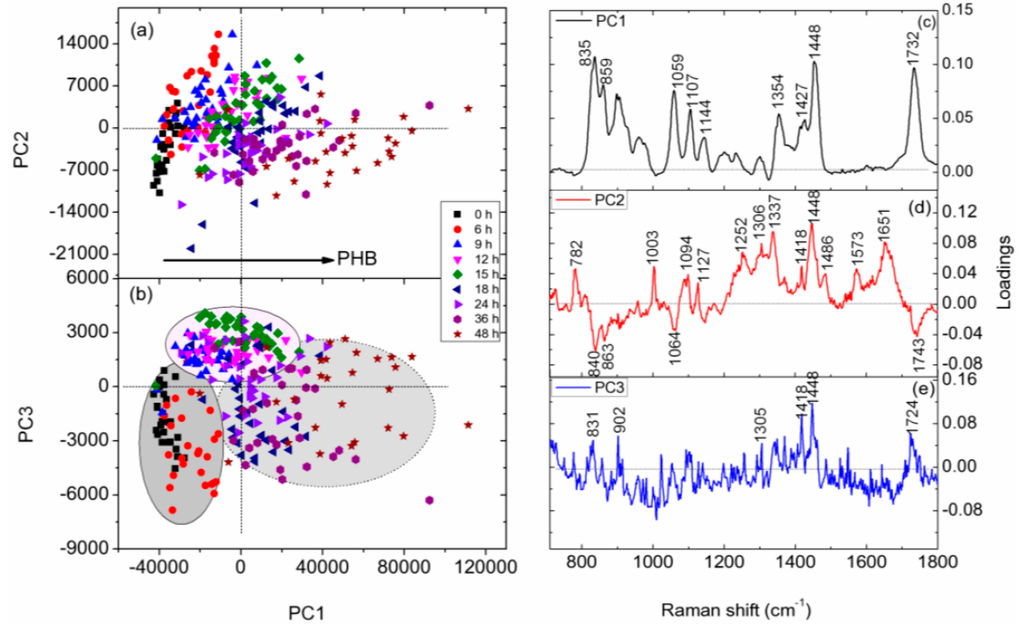 PCA is a sensitive chemometric technique that can recognize small spectral variations in large sets of Raman spectroscopic data. In this investigation, PCA was performed on the Raman spectra of C. necator H16 cells cultivated for 0, 6, 9, 15, 18, 24, 36, and 48 h (Figure 6). In the scatter plot of PC1 and PC3 scores (Figure 6b), the spectral data for bacterial cells are clustered into three groups according to the microbial growth phase: 0 and 6 h, corresponding to the lag phase; 9, 12, and 15 h, corresponding to the exponential phase; and 18, 24, 36, and 48 h, corresponding to the stationary phase. PC loadings can provide insight into the physical basis responsible for this discrimination. The relatively high loadings on PC1 and PC3 are Raman bands assigned to PHB at 835, 901, 1058, 1104, 1354, 1418, 1456, and 1732 cm−1 (Figure 6c,e), indicating that the variations in PHB content inside C. necator H16 cells at different growth stages contributed mostly to the separation observed in the above PCA scatter plot. By contrast, Raman bands associated with nucleic acids (located at 782, 1094, 1337, 1486, and 1573 cm−1) and proteins (located at 1003, 1448, and 1651 cm−1) dominate the PC2 loading plot (Figure 6d); hence, the PC2 score can be seen as a measure of bacterial growth activity—i.e., the larger the PC2 score value, the more active the bacterial growth. Examination of the scatter plot of PC1 and PC2 scores (Figure 6a) allows identification of the metabolic states of C. necator H16 cells in various cultivation stages. Most bacterial cells in the lag phase and early and middle exponential phases (3–15 h)—which exhibit high PC2 score values but low PC1 score values—were in the active growth state, whereas the bacterial cells in the stationary phase—with low PC2 score values but high PC1 score values—accumulated large amounts of PHB and were in the growth arrest state.