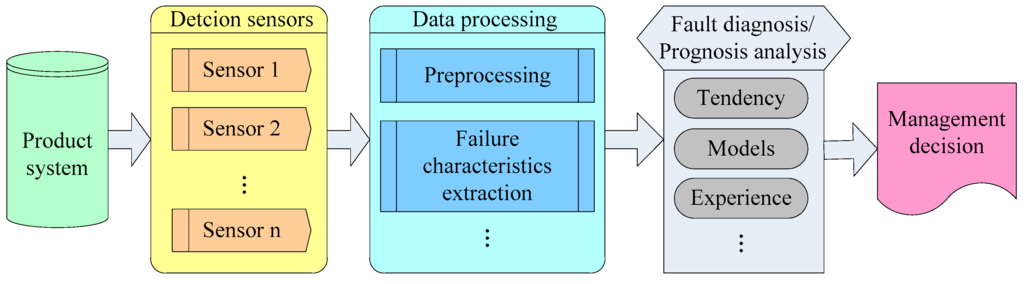As Figure 3 shows, PHM technology makes use of sensors to collect characteristic parameters related to system properties, and combines them with historical data and model parameters. With the help of an algorithm and a model, detection and diagnosis/prediction of defects can be conducted, and manage decision focusing on working state will be made further more. That is to say, whether defect alarms are needed can be judged through this method. As well, residual life, degradation degree and the probability of finishing a mission can be predicted by taking advantage of PHM technology.