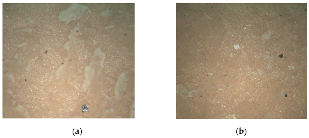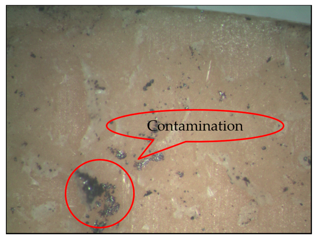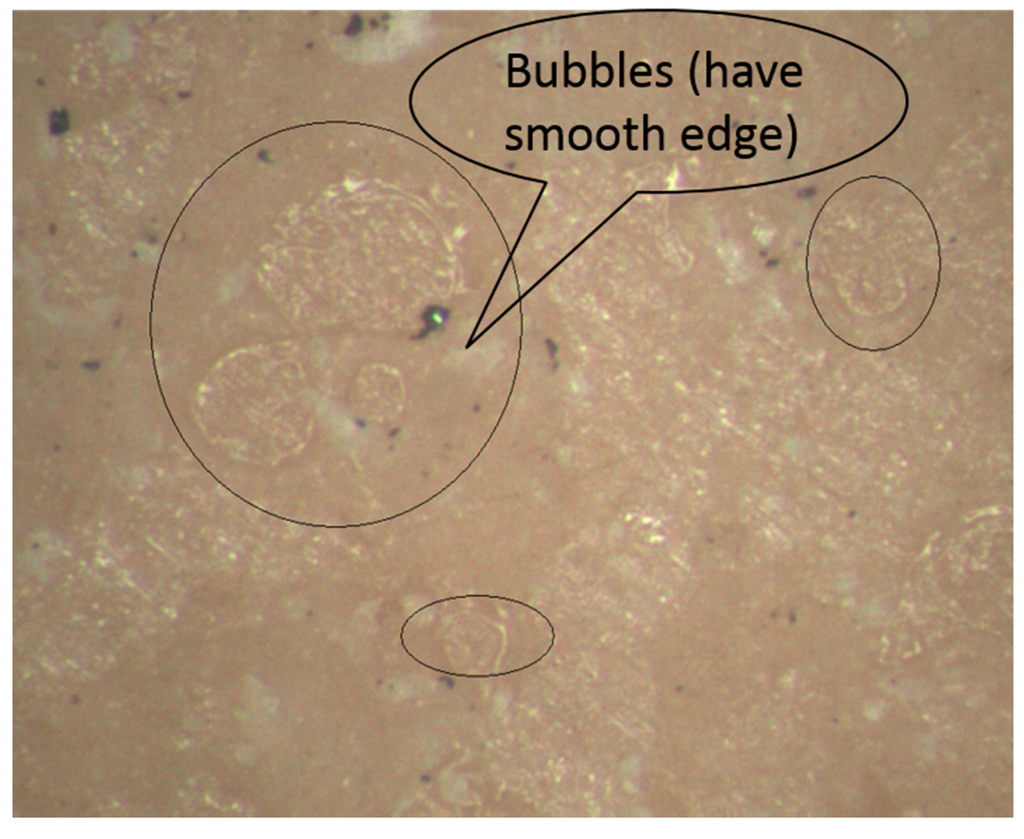 On the other hand, after the control measures were applied, ten qualified products were chosen for analysis and verification. The morphology of a transverse section showed that there were only a small amount of air bubbles, and their area was small, as shown in Figure 16.
