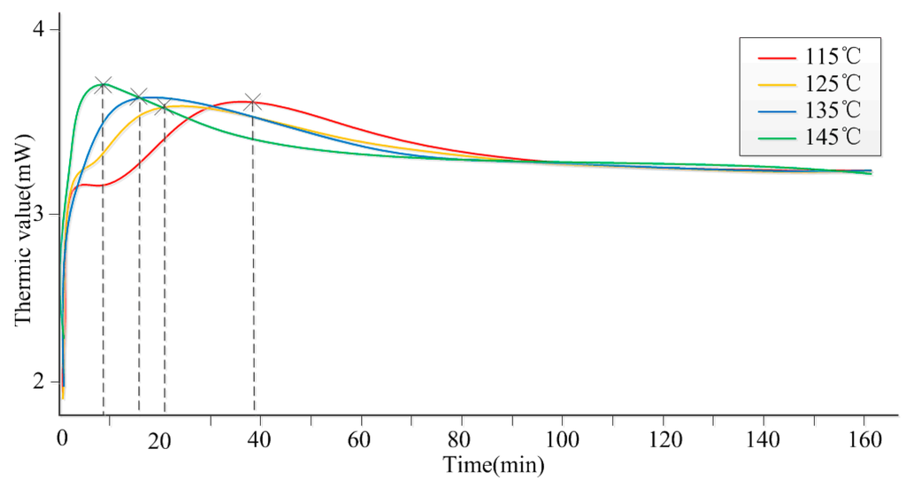 In order to determine the dynamic parameters of the curing process, and the quantitative relationship between curing degree and curing temperature, curing time, a DSC test was conducted at four temperature levels ranging from 115 °C to 145 °C. This method is one of the most mature tools to research the process kinetics of thermosetting resins curing processes. The DSC curve shows the correlativity between samples’ exothermic/endothermic value and time. In our case, the adhesive curing process in an exothermic reaction, and its DSC curve is shown in Figure 5.
