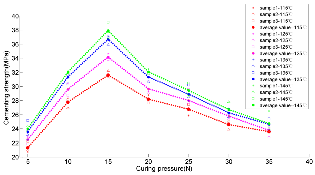 For the sake of establishing the relation between cementing strength and curing degree and curing time, 28 group tests were conducted. There were four different temperatures (115, 125, 135 and 145 °C). Under each temperature there were seven groups, corresponding to seven curing pressures (5, 10, 15, 20, 25, 30 and 35 N). Three samples were extracted from each group to make comparisons. Due to different curing time under different temperatures, we set 2 h so that every sample could cure. The process test combined engineering experience and the DSC analysis results. In addition, the limiting expenses and time were also considered. The test scheme and data records are shown in Table 1 and Figure 6.