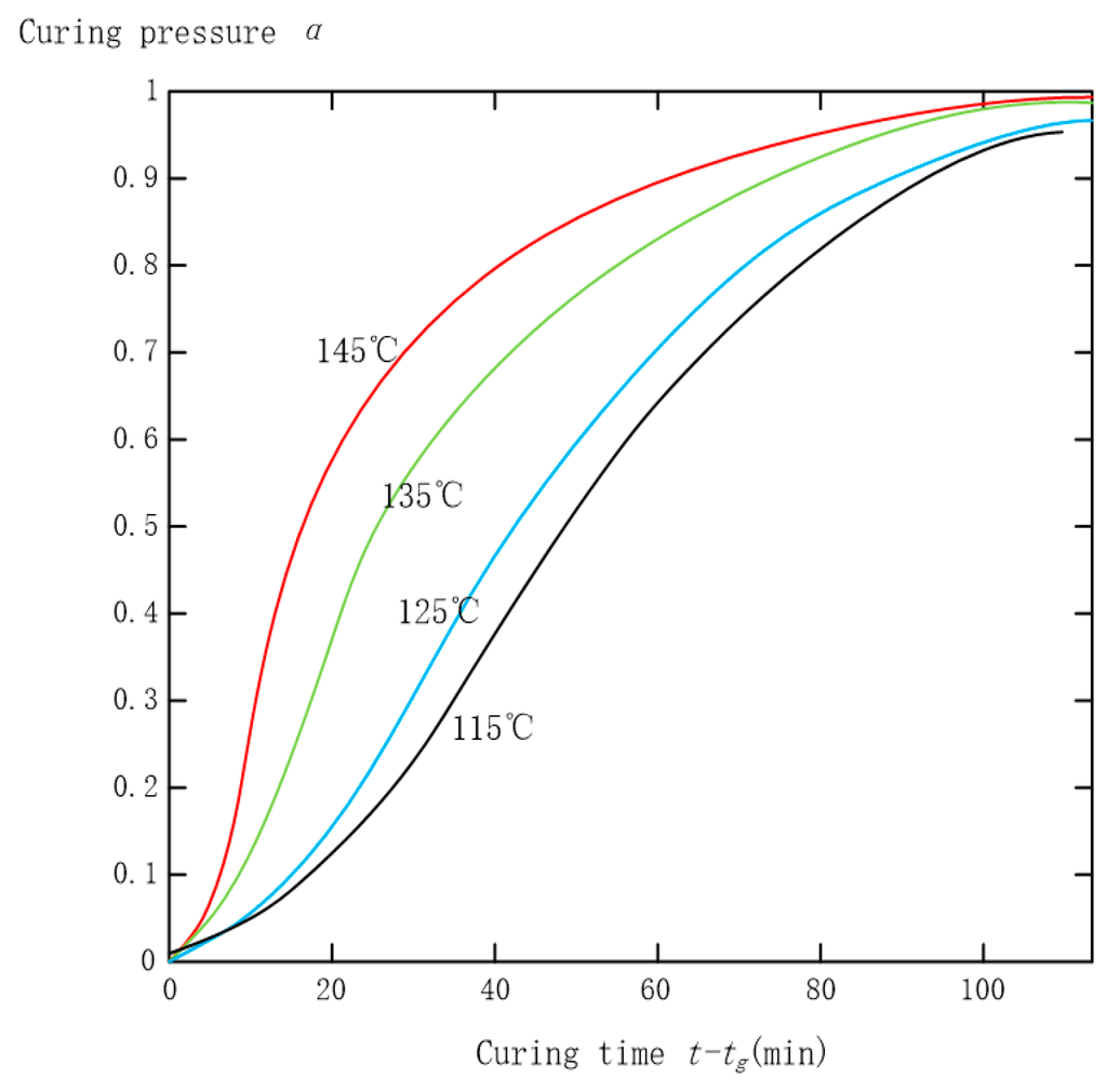 The constant k in Equation (1) has a temperature dependency. Meanwhile, curing is a thermal activation process. The equation between k and curing temperature is as follows [34]: