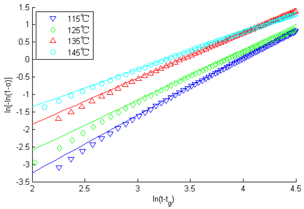 It is clear that (1/n)∙lnk is linear to 1/T. ln(t − tg) is made to be the abscissa and ln[−ln(1 − α)] the ordinate, and Figure 9 is accomplished. Values of activation energy Ea of curing system reaction and antecedent factor A are available. They are shown in Table 2 too.