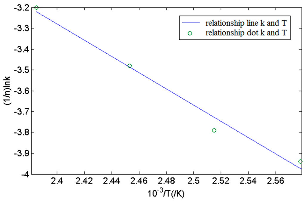 The constant k has a temperature dependency. Based on Equation (2), the relationship between k and curing temperature T can be represented as follows: