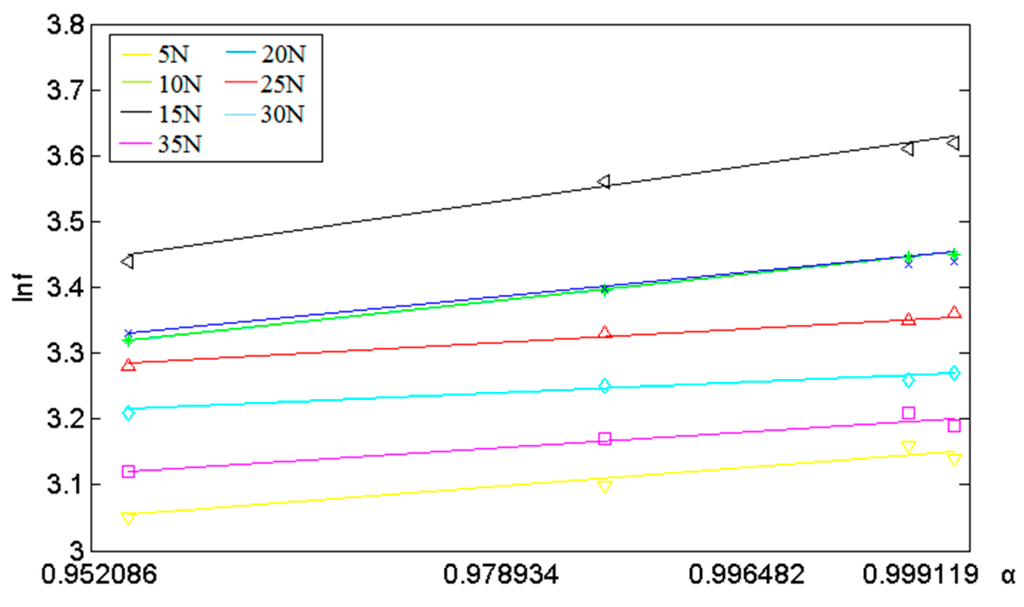 According to Equation (7), it is clear that there is a linear relationship between ln(f/N) and curing degree α, and curing pressure N. It is shown as Equation (8). We used the data in Table 1 and through binary linear regression analysis, the parameters in Equation (7) relative to the model can be obtained. The multiple correlation coefficient of regression analysis is 0.9908, which means that the assumptive model is reasonable: