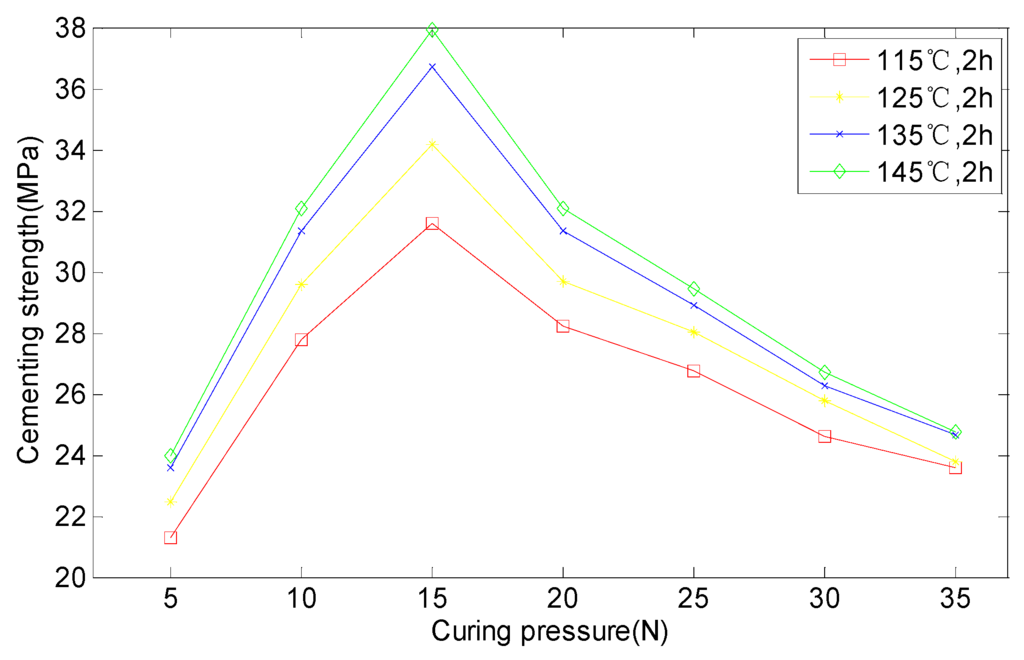 It is shown in Figure 5 that the time for the resin adhesive to display its maximum heat release is different under different temperatures. Specifically, it is 40 min at 115 °C, 20 min at 125 °C, 15 min at 135 °C and 10 min at 145 °C. When the heat emission achieves its maximum, the resin adhesive starts to curing. That is to say, without considering curing pressure, curing time has a negative correlation with temperature. It is known that gas and water in the resin will release easier at higher temperature. Better bonding strength as the output will be obtained. However, temperature is not the only influencing factor, as curing pressure needs to be considered, too. Therefore, tests concerning temperature and pressure were conducted to help with the research.