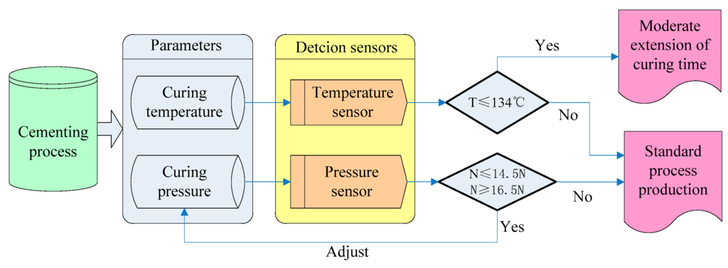In Figure 11, in view of the ferrite phase shifter cementing process, detection parameters (curing temperature and curing pressure) of potential defects were ensured. According to the PHM model shown in Figure 3, temperature sensors were used in on-line detection of the curing temperature, while pressure sensors were used in the curing pressure’s on-line detection. Based on the on-line detection criteria confirmed from Table 3 and Table 4, we can be sure that the normal conditions are a temperature higher than 134 °C and a pressure between 14.5 N and 16.5 N. When the temperature is lower than 134 °C and the pressure is lower than 14.5 N or higher than 16.5 N, the cementing process is in an abnormal state. If the temperature does not meet the criterion, curing time should be prolonged. If it is a result of pressure, it should be adjusted in time.