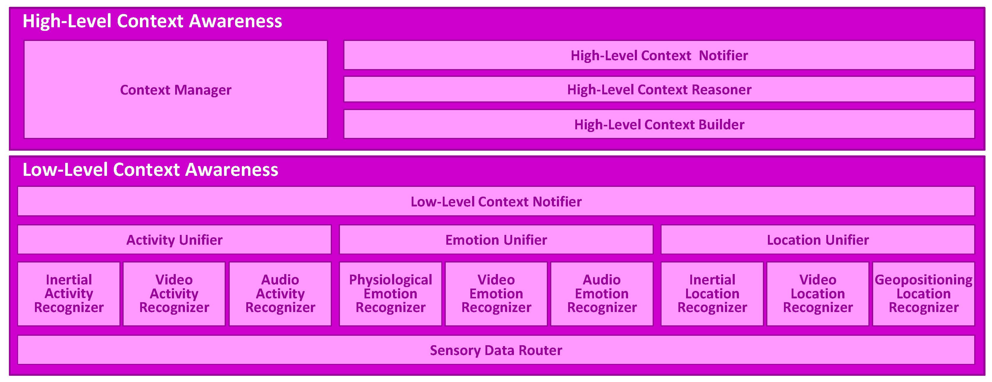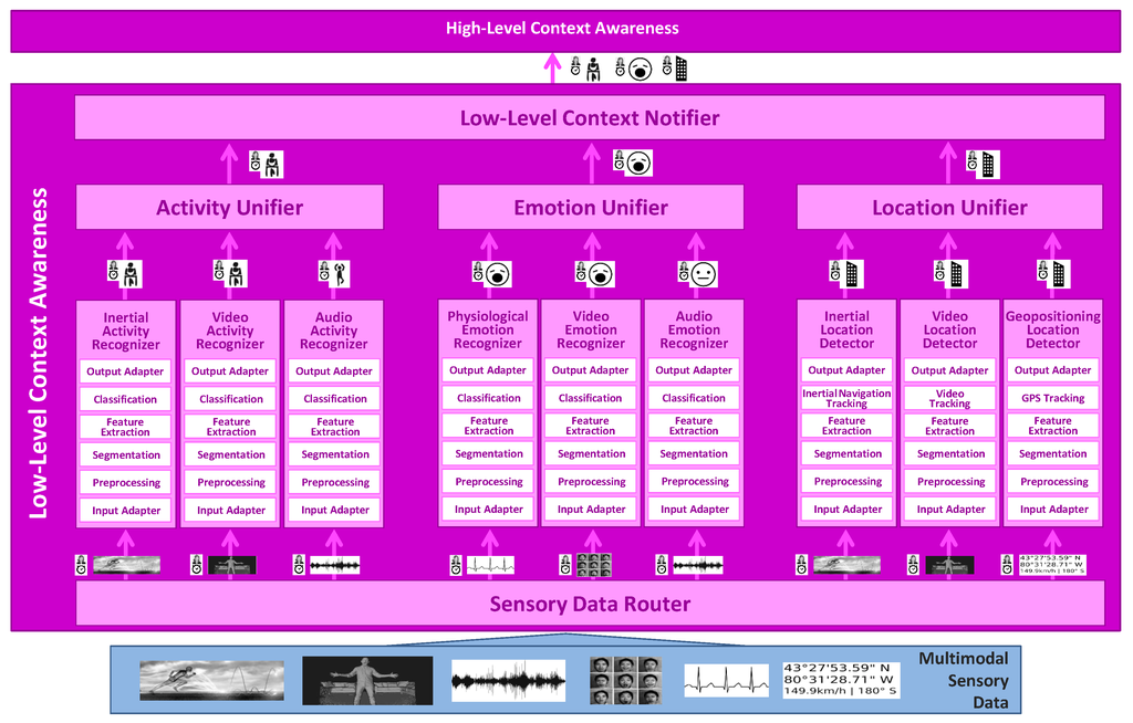 This work describes the multimodal context mining framework, an innovative means to support automatic behaviour tracking in a holistic manner through the continuous and comprehensive inference of multimodal human context from heterogeneous sensory data. A unique characteristic of the proposed framework consists of the two levels of context granularity it provides, namely low- and high-level contexts. Low-level context categories, such as user’s physical activity, emotional states and locations, are discovered by means of signal processing and machine learning mechanisms. These categories are combined in a more abstract level through ontological mechanisms in order to determine high-level representations of the user’s context. This paper further extends prior work [20,21,22] while providing an exhaustive evaluation of the potential and validity of the proposed solution. In this sense, this paper presents a more functional and applied perspective of the low-high level context dualism, as well as the mechanisms to obtain one out of the other. Similarly, it goes beyond prior contributions, which mainly elaborated on accelerometer data to infer the user’s physical activity in order to describe their behaviour. Conversely, this work reveals a more comprehensive picture of the user’s context by not only inferring physical, but also emotional and location information by using new sensing modalities, such as audio, video and geopositioning data. Furthermore, this work makes use of a more opportunistic sensing approach [23], based on a multimodal sensor setup, including technologies intended for not only outdoor, but also indoor scenarios. The rest of the paper is organized as follows. Section 2 describes the multimodal context mining framework and its main components. Section 3 presents a realization of the proposed framework, including the technologies used for its implementation. The performance of each context recognizer, as well the awareness capabilities of the platform as a whole are evaluated and discussed in Section 4. The main conclusions of this work are summarized in Section 5.