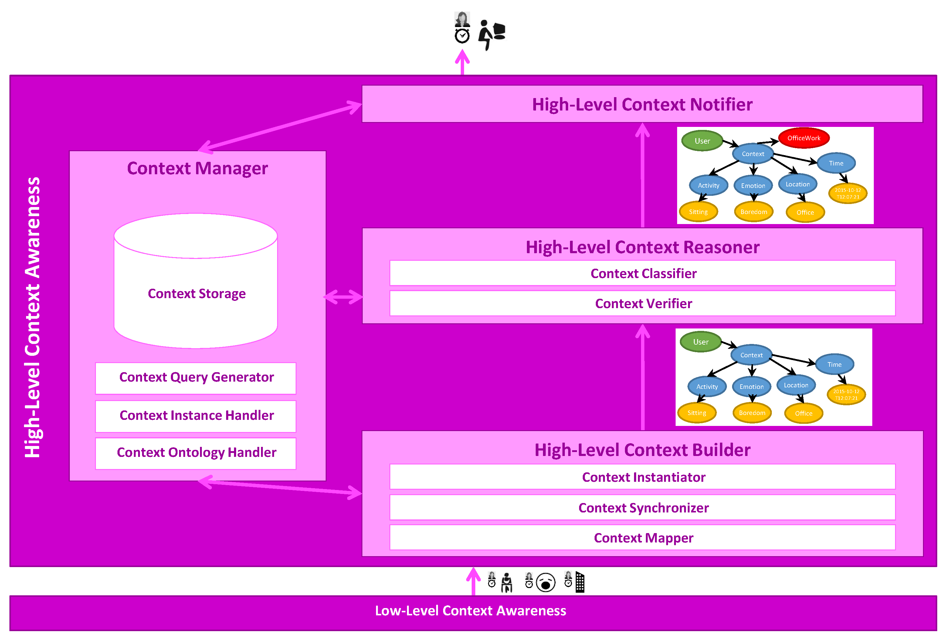 The High-Level Context Notifier makes available to third parties the newly-identified high-level contexts. The High-Level Context Notifier receives from the High-Level Context Reasoner a classified high-level context instance and notifies the subscribed third parties about the detection of a new high-level context. As per the LLCA, this process is only conducted if the new instance belongs to a different high-level context type than the previous one. Likewise, only changes in the high-level context type are notified; this means that differences in the low-level context composition that do not imply a change on the type of high-level context are not communicated to the third parties. Furthermore, the High-Level Context Notifier stores the high-level context into the Context Manager for its persistence.