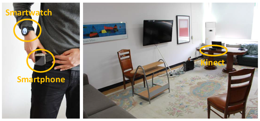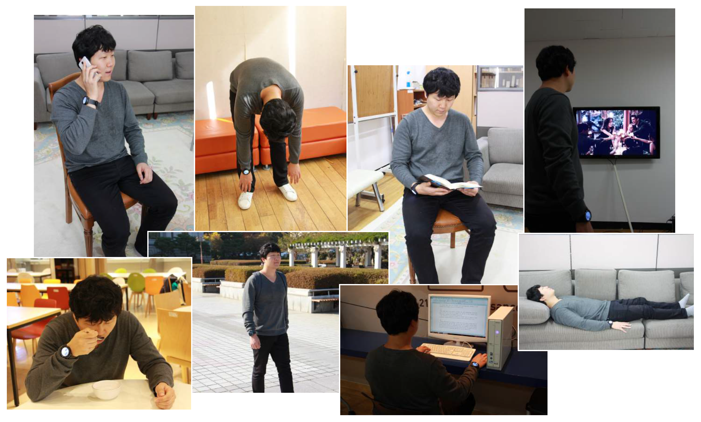 The multimodal context mining dataset (available for download at http://www.miningminds.re.kr/technical-report/datasets/), also referred to as the Mining Minds dataset, comprises inertial, geopositioning, audio and video data collected for multiple users at various locations of Yongin city (Korea). A total of ten male subjects (S1–S10) were involved in the collection of the dataset (see Table 1). The volunteers were asked to perform a set of quotidian actions involving physical activities (Eating, Running, Sitting, Standing, Walking, Stretching, Sweeping and Lying Down), locations (Home, Office, Restaurant, Gym and Mall) and various emotions (Anger, Happiness, Neutral and Sadness). In order to procure a naturalistic collection of the contexts of interest, it was proposed to the users to freely execute similar related actions (Figure 4). Thus, for example, instead of explicitly requesting the users to sit down, the expert asked them to write a letter using the desktop computer. For the data collection process three devices were respectively used: a Samsung Galaxy S5 smartphone, an LG G Watch R smartwatch and a Kinect v2 video device (Figure 5). The smartphone and smartwatch were used for registering the user’s physical activity. The 3D acceleration and 3D rate of turn registered on the subject’s wrist (smartwatch) and another arbitrary body part to the user’s choice (smartphone) were collected at a 50-Hz sampling rate through the accelerometer and gyroscope sensors embedded into both mobile and wearable devices. Besides, the smartphone’s GPS sensor was used to register every second the longitude and latitude coordinates describing the location of the user. The smartphone was also used to record at 44.1 kHz the audio signals generated by the subject during some arbitrary phone calls intended to capture emotional states. For the home scenario, the depth video camera was used to also register the user’s body motion. The labelling of the dataset was carried out by using a remote application, which was handled by the expert or observer. All of the data collection sessions were also video taped to check anomalous or unexpected patterns in the data and to correct labelling mistakes during the posterior curation of the dataset. The entire dataset contains over ten hours of data, which accounts for approximately one hour per user in average. The duration of each of the considered low-level contexts is variable since subjects were not requested to perform any action for a specific period of time.