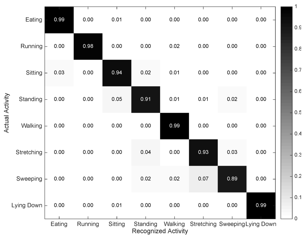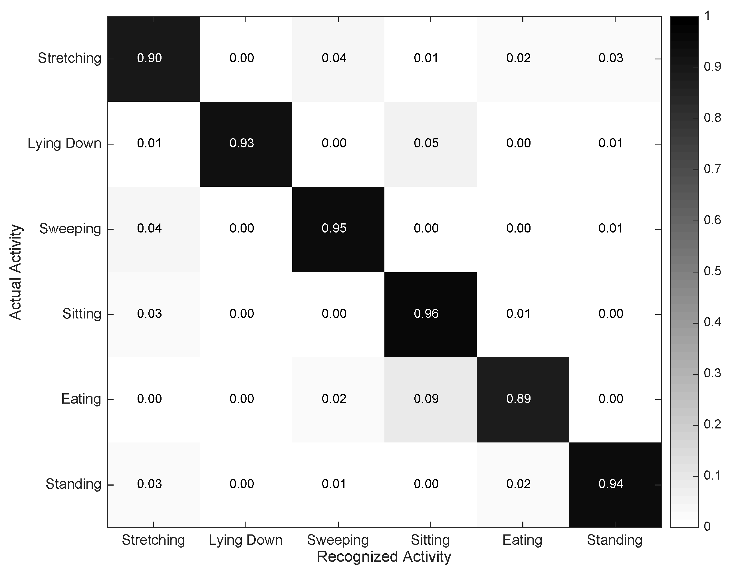 The confusion matrix for the Inertial Activity Recognizer is depicted in Figure 6. As can be observed, the developed recognition model seems to yield a high performance. After inspecting the confusion matrix, a few misclassifications can be identified for the pairs Sitting-Standing, Sweeping-Stretching and Standing-Stretching. Sitting and standing are passive activities involving low levels of motion; thus, the registered acceleration and rate of turn patterns tend to be more similar for these pairs of activities than for the others. Sweeping and stretching are sometimes misclassified, as both actions involve relatively similar movements from an intensity perspective. As a matter of fact, since users were given the liberty to execute all of the actions on their own, it was seen that some subjects bent their waist and stretched their arms notably while Sweeping, which matches with some of the observed stretching executions. This also applies for the Standing and Stretching case. On the one hand, some volunteers performed the stretching in a very light fashion, thus rather leading to low-intensity motions; on the other hand, various subjects moved the upper limbs while standing, movements that may coincide with some stretching patterns.