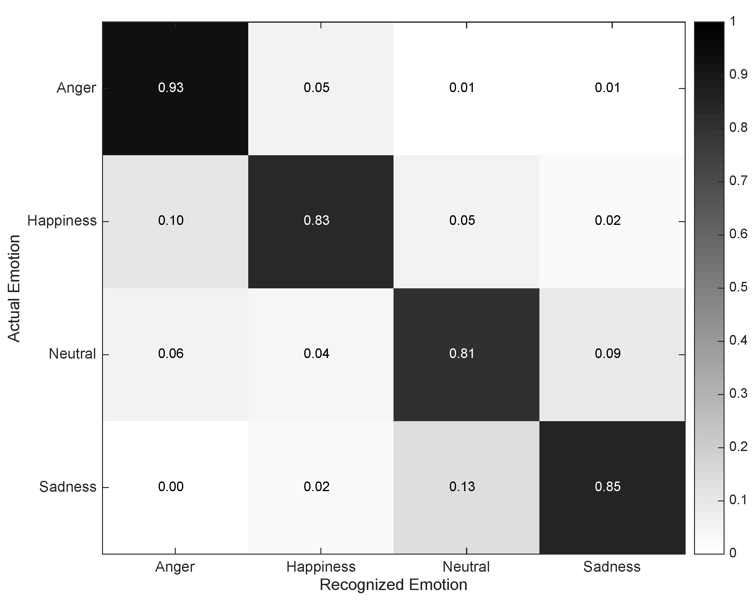 The confusion matrix for the Audio Emotion Recognizer is depicted in Figure 8. Anger and Sadness are most precisely identified, while worse results are obtained for Happiness and Neutral states. Anger and Happiness tend to be confused due to the loud tone used, for example while yelling or cheering. On the other hand, Sadness and Neutral are confused owing to the soft nature of the dialogues taking place during these states. Overall, the recognition capabilities shown by this model are more modest than for the previous recognizers. The reason for this rather mediocre result is fairly motivated by the complexity associated with registering realistic emotional states. While collecting realistic activity or location data turns out to be relatively feasible, even in the presence of experts or other people, reaching a realistic emotional performance is hard to attain in these very conditions. Apart from professional actors, people tend to feel embarrassed while conducting some fictitious dialogues involving certain emotions of interest. This is recognized to be one of the most important challenges in the emotion recognition and affective computing domains. More than that, other issues related to the large differences in tone, volume and pace among subjects make this task especially challenging.